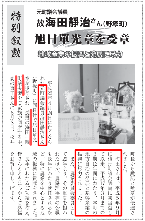 海田一時さんの父・海田静治さんは、農業を中心とする地域の振興に貢献をし、2010年に天皇陛下から勲章(旭日単光章)を受賞しています。