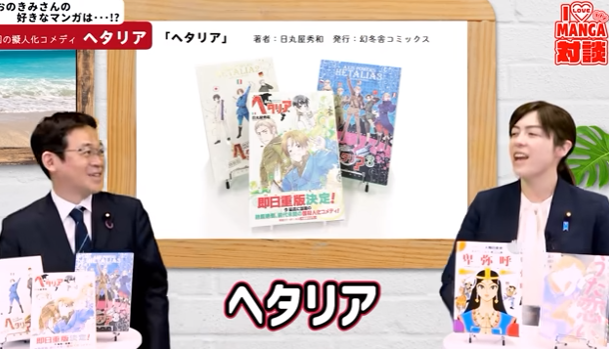 小野田紀美さんは、2023年の自民党のYoutubeチャンネルでは、「好きな漫画」として「ヘタリア」を挙げていました。