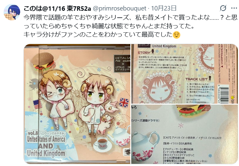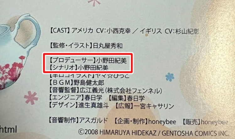 小野田紀美さんは「honeybee」に所属し、ヘタリアの朗読CD「羊でおやすみシリーズ」のプロデューサー&シナリオを務めていました。